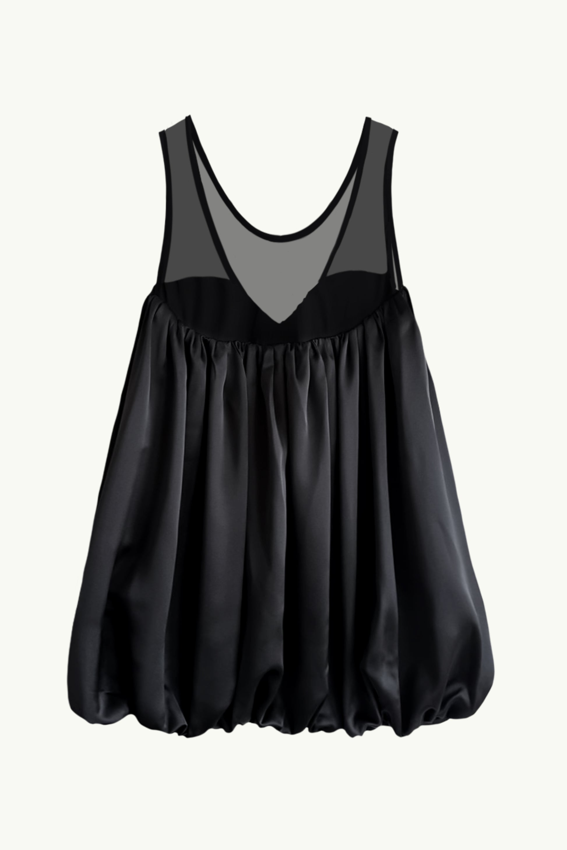 Black satin bubble mini dress with a sheer mesh top and loose, voluminous silhouette.