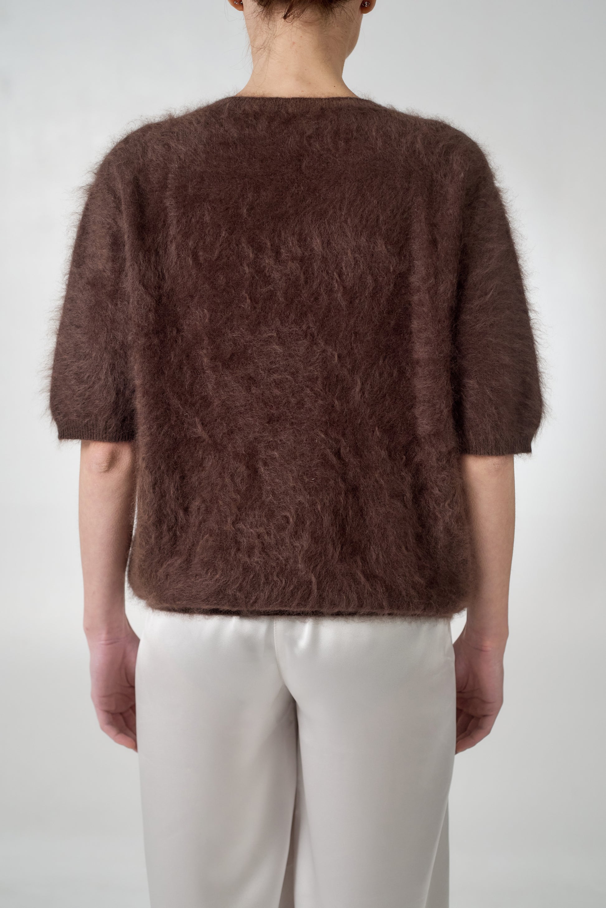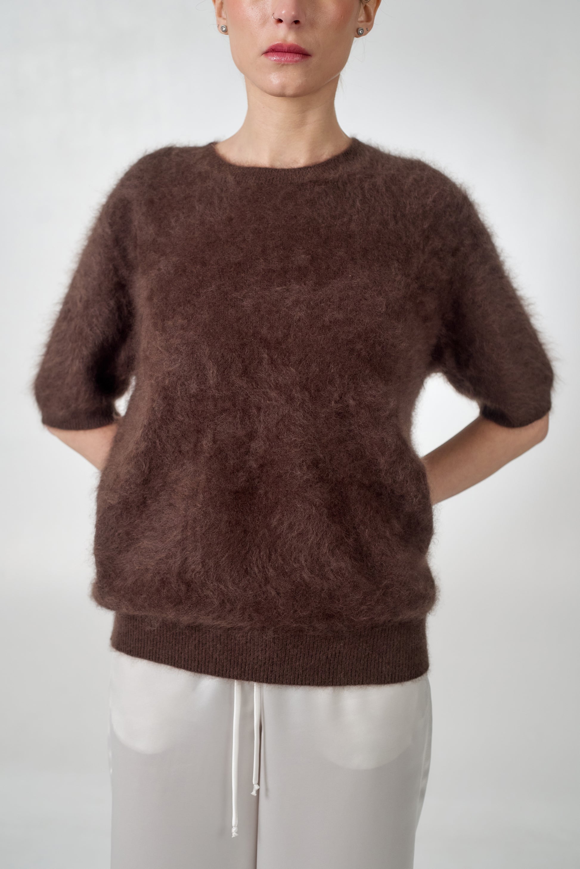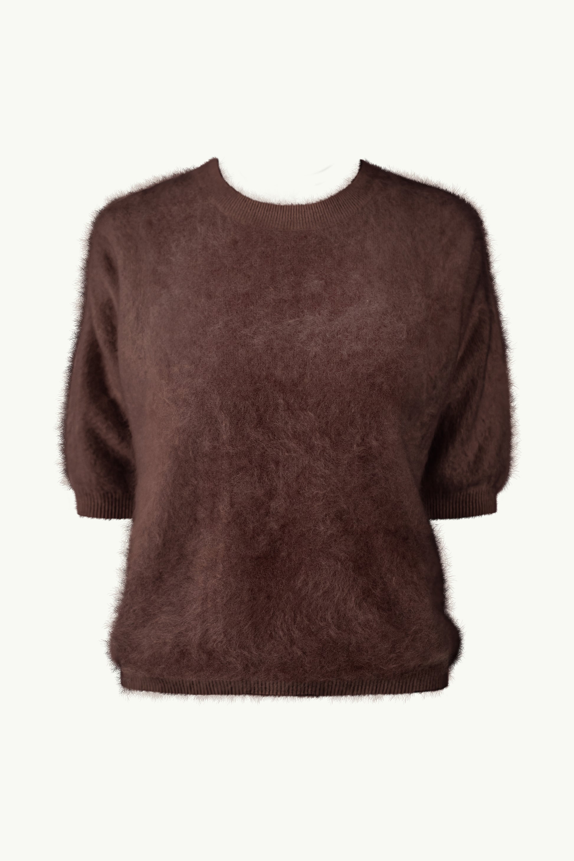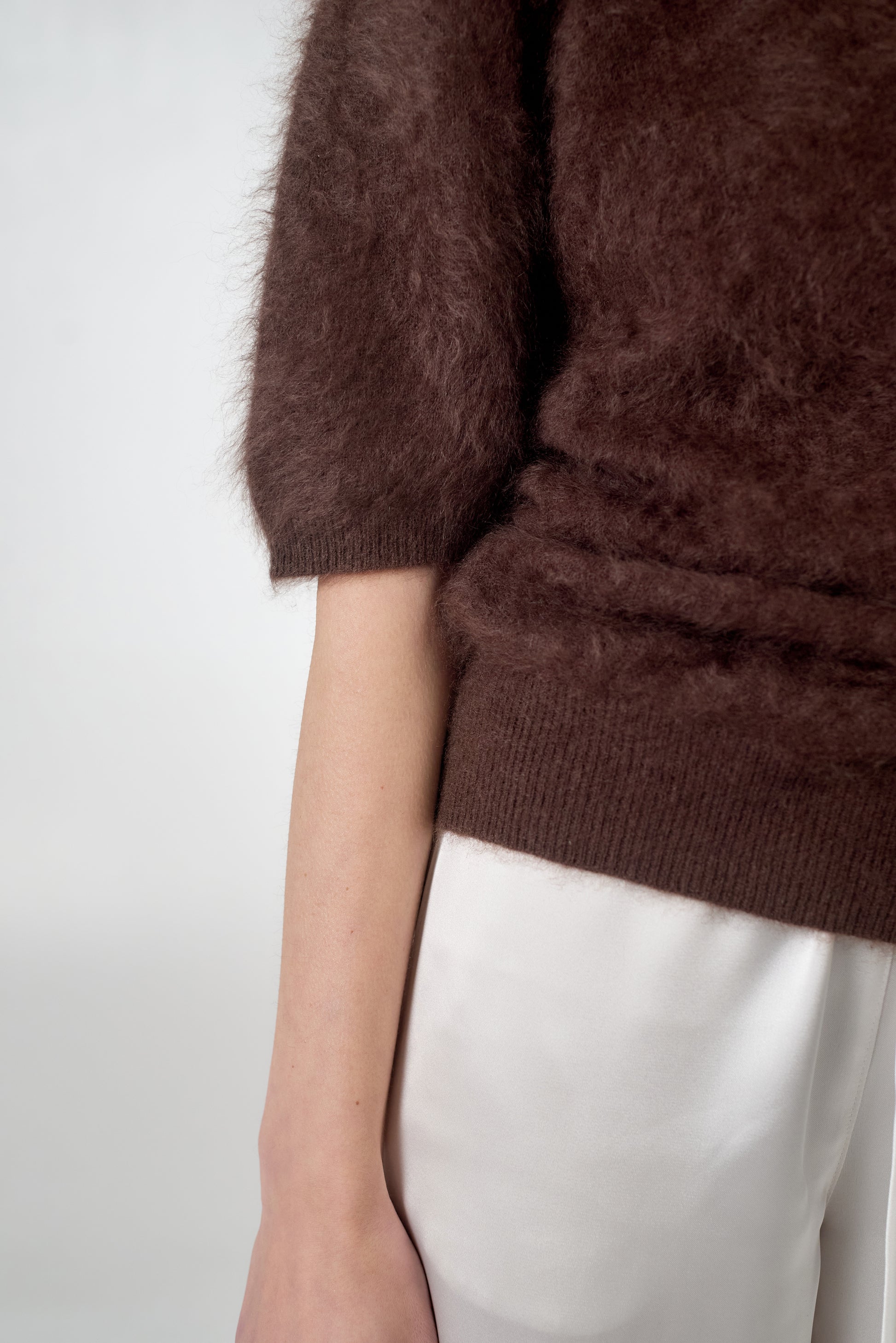 A soft chocolate-colored cashmere sweater with a round neckline and ribbed trims, offering both warmth and timeless elegance.